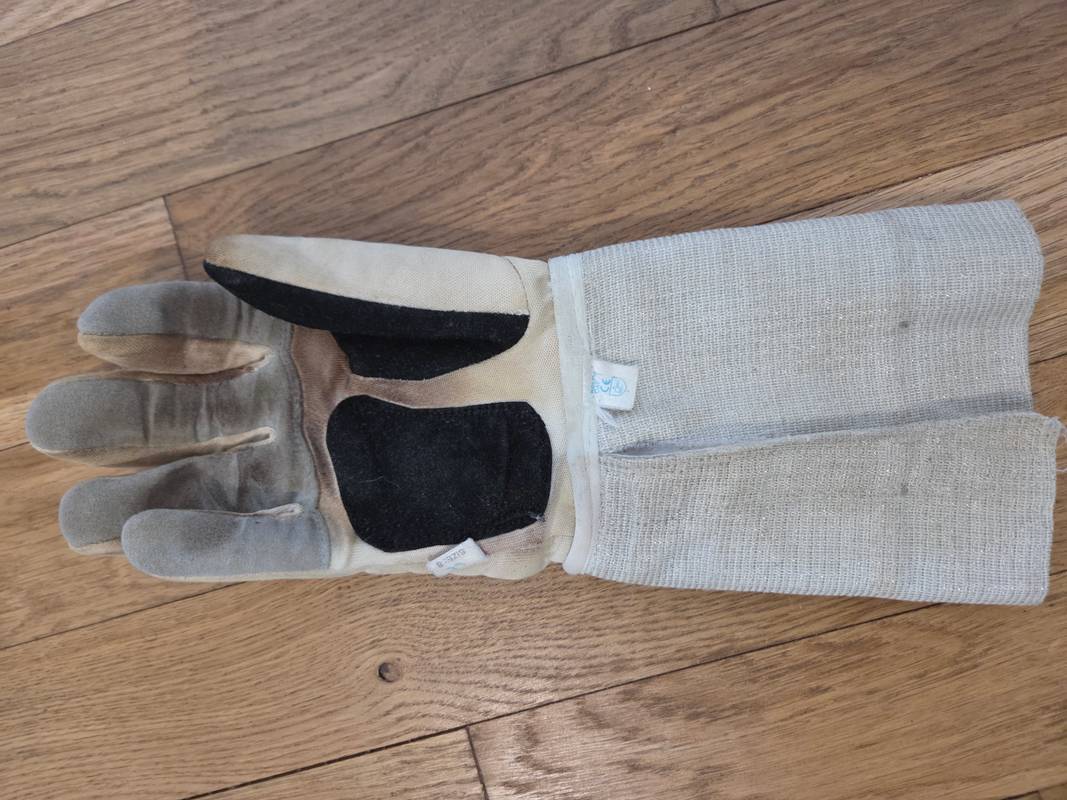 Gant de sabre électrique, planète escrime, droitier, taille 8. Très bon état, légèrement oxidé (ne passe pas en compétition). Idéal pour l'entraînement.