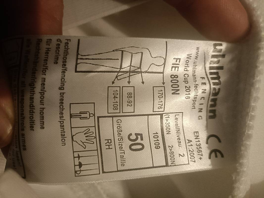 UHLMANN pantalon hommes Worldcup 800N (FIE) - Tailles: 50 (équivalent à du 42 ou 44), voir l'étiquette Pantalon utilisé que deux fois